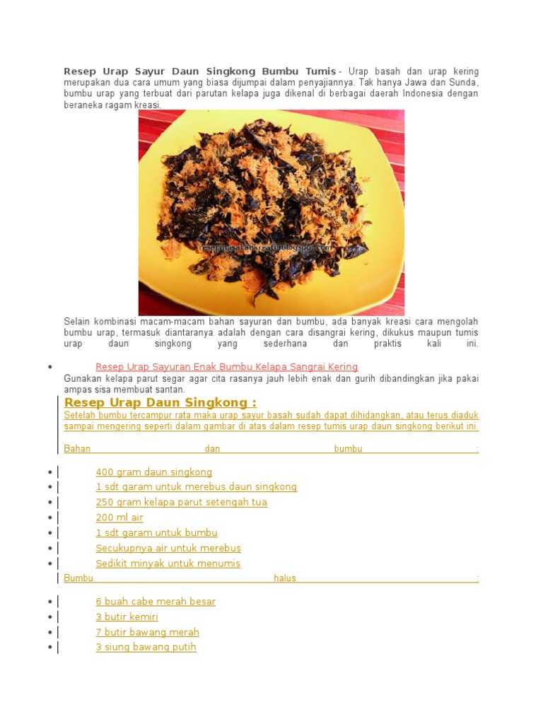 Resep membuat urap daun singkong. Urap daun singkong sangat disukai masyarakat indonesia. Daun singkong juga mengandung nutrisi, mulai dari protein, lemak, serat, vitamin, dan mineral penting dibutuhkan tubuh. Resep bahan urap daun singkong. Resep urap daun singkong bumbu tumis tak hanya populer di jawa dan sunda, aneka sayur dengan bumbu urap yang terbuat dari parutan kelapa juga 400 gram daun singkong 1 sdt garam untuk merebus daun singkong 250 gram kelapa parut setengah tua 200 ml air 1 sdt garam untuk bumbu.